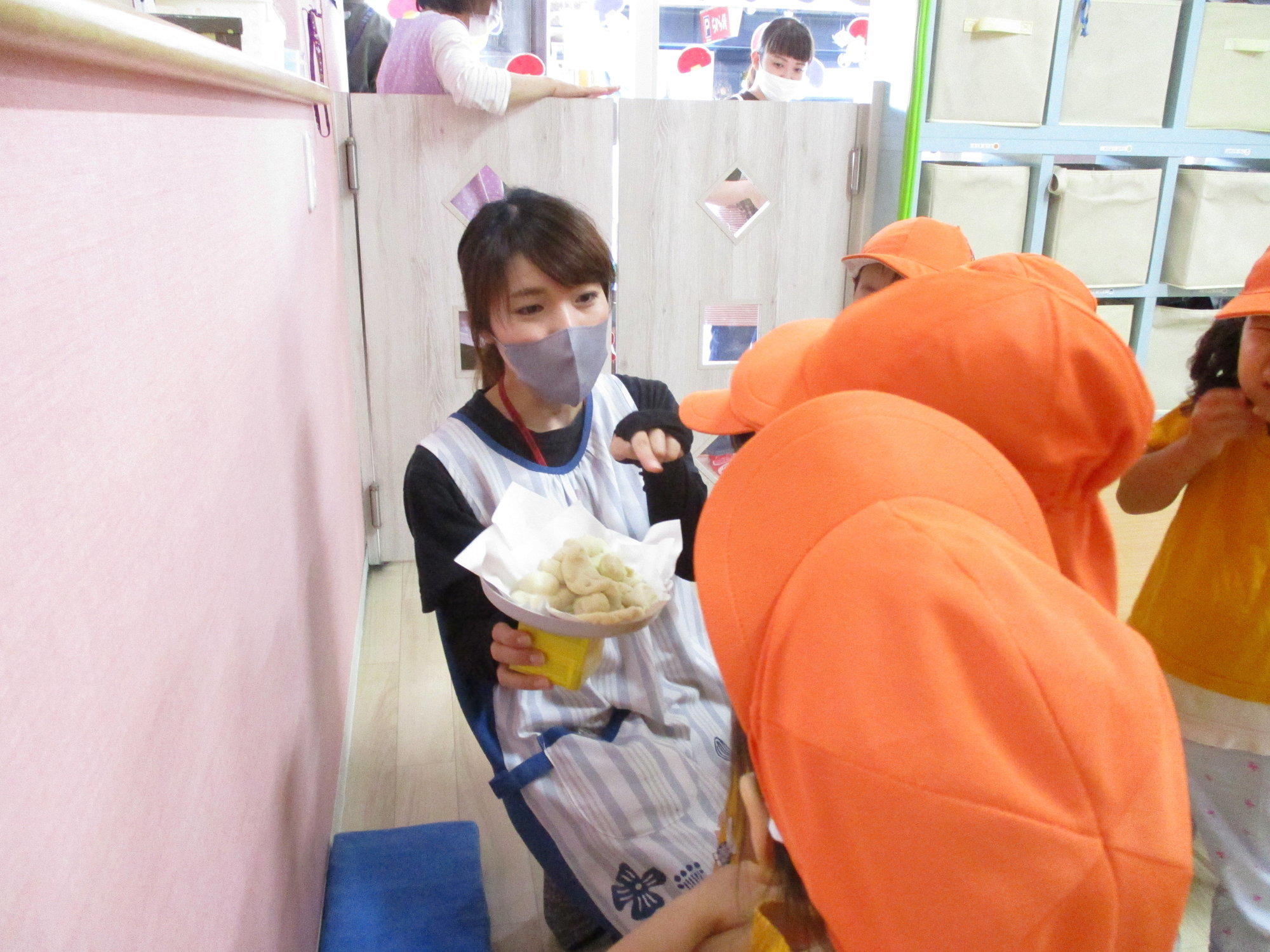 2歳児さんは上手に丸めることができました。1歳児さんは、丸めるよりのばしたりぺったんこにしたり、感触を楽しみましたよ。