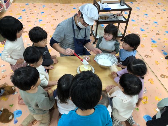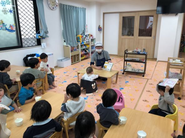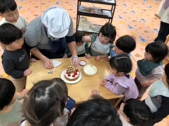 給食先生がおやつの前に「おたすけこびと」の絵本を読んで、みんなの前でケーキを仕上げてくれました(⌒∇⌒)